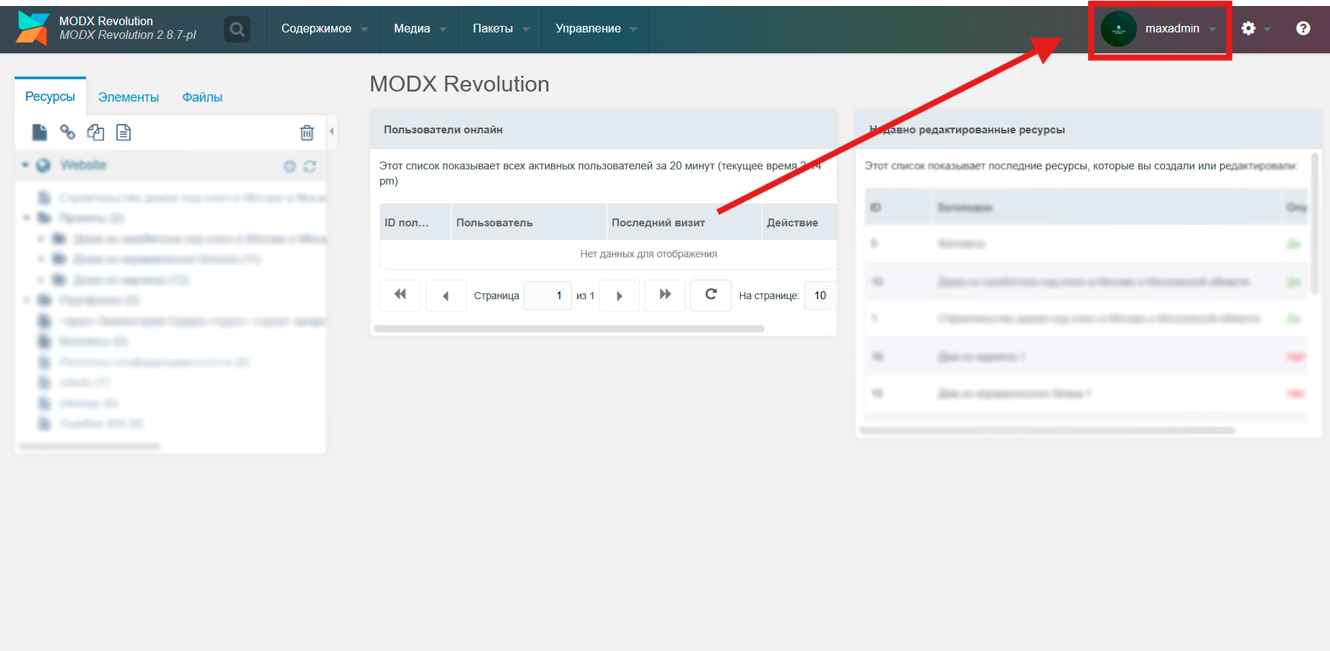 Когда вы попали в панель администрирования MODX (https://название-вашего-сайта.ру/manager/), в правом верхнем углу вы увидите иконку вашего профиля и логин.