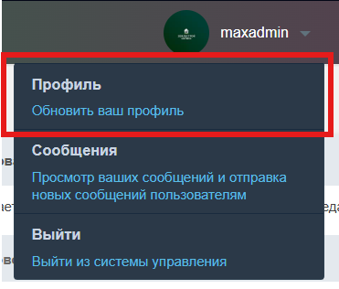 Наведя курсор на иконку профиля, вы увидите всплывающее меню с разделами: “Профиль”, “Сообщения”, “Выйти”. Нажимаем левой кнопкой мыши на вкладку “Профиль”.
