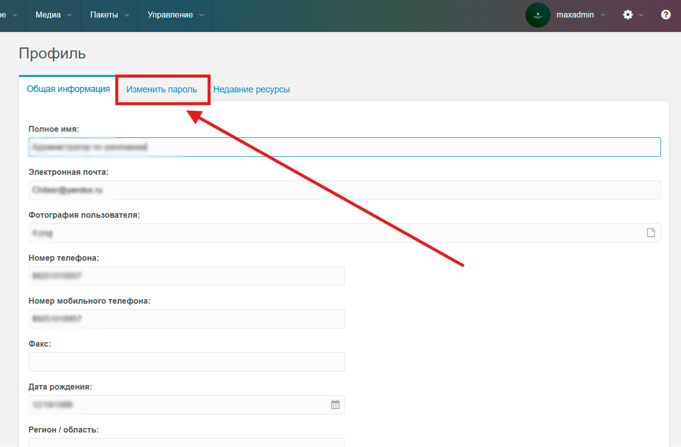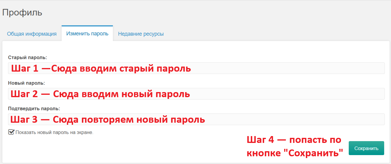 Перейдя в профиль, откроется ваша общая информация, а сверху вы найдете разделы: “Общая информация”, “Изменить пароль”, “Недавние ресурсы”. Как вы могли догадаться, нас интересует вкладка “Изменить пароль”, скорее нажимайте на нее!