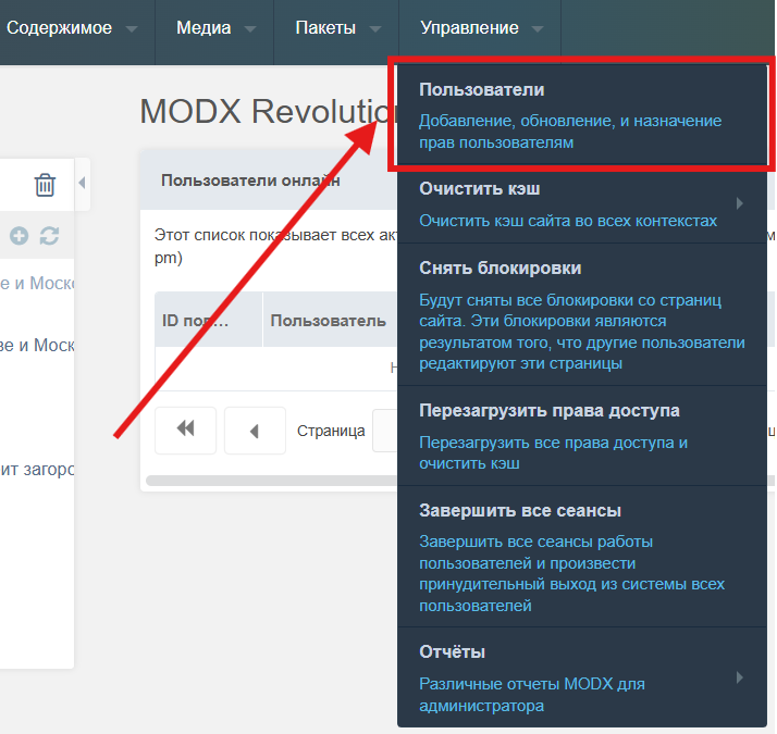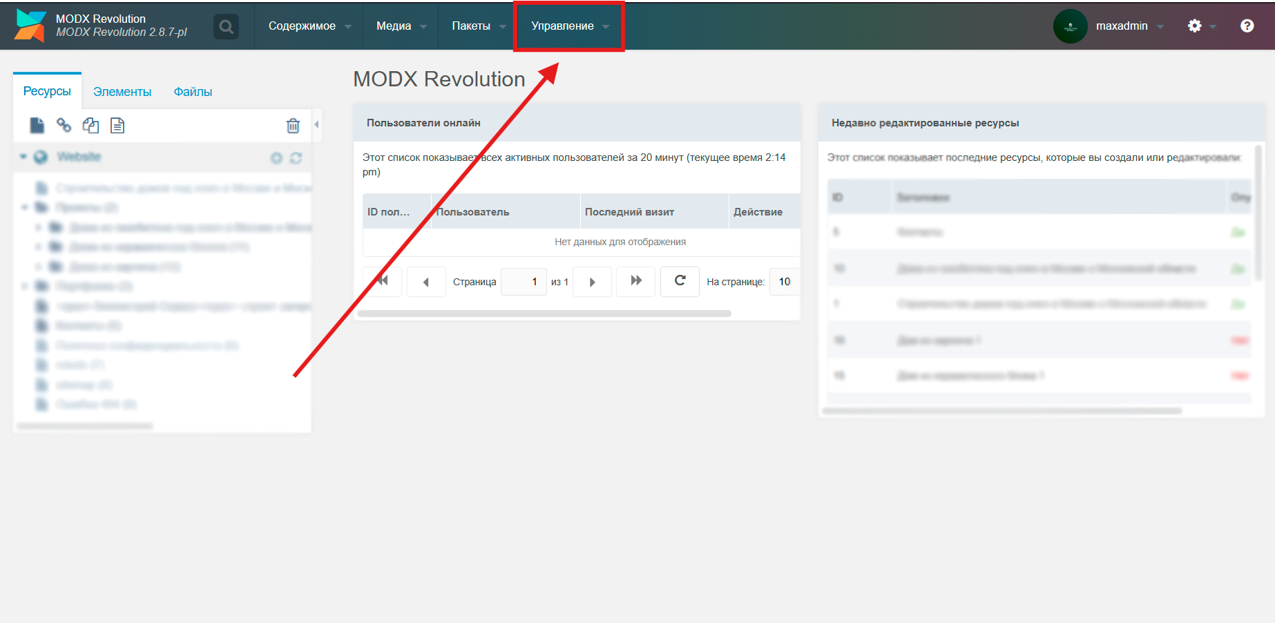 Находясь в панели администрирования MODX (https://название-вашего-сайта.ру/manager/), обратите внимание на разделы сверху: “Содержимое”, “Медиа”, “Пакеты”, “Управление”. Нас интересует вкладка “Управление”, наведите курсор мыши на нее.