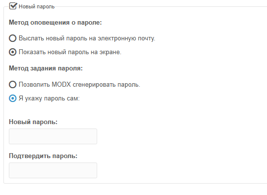 Появится меню, в котором вы выбираете: отправить пароль на почту или показать на экране. Также можете доверить генерацию пароля MODX или придумать свой пароль самостоятельно.
